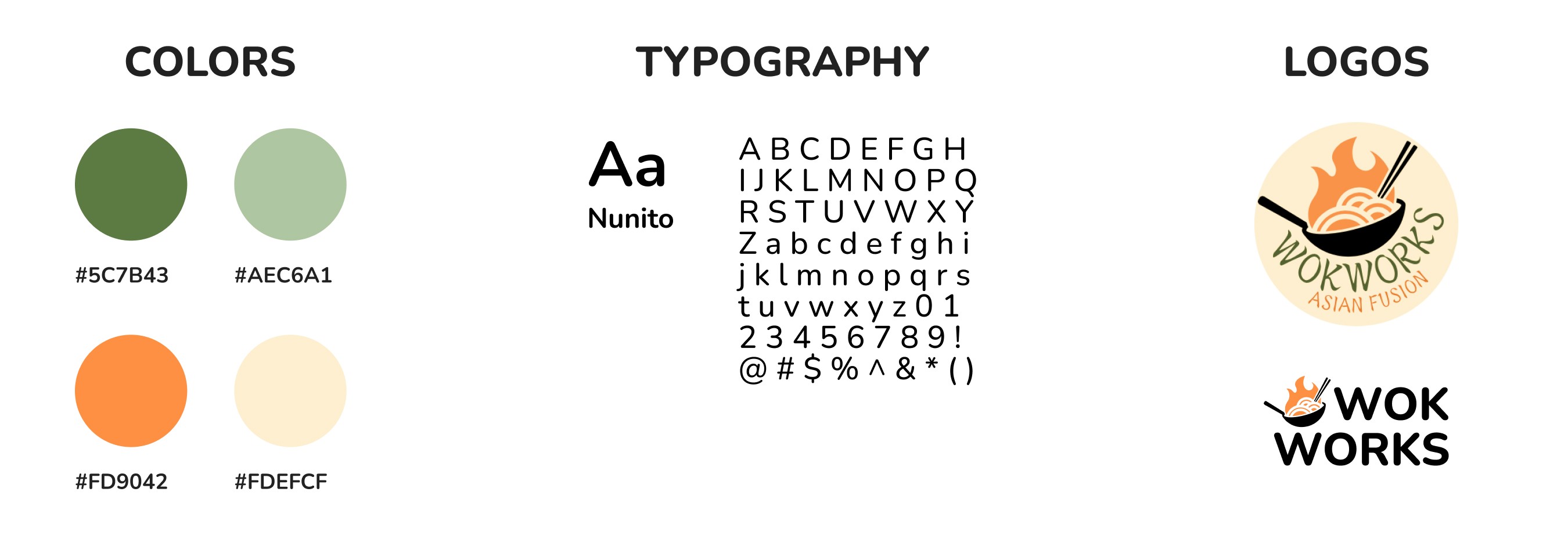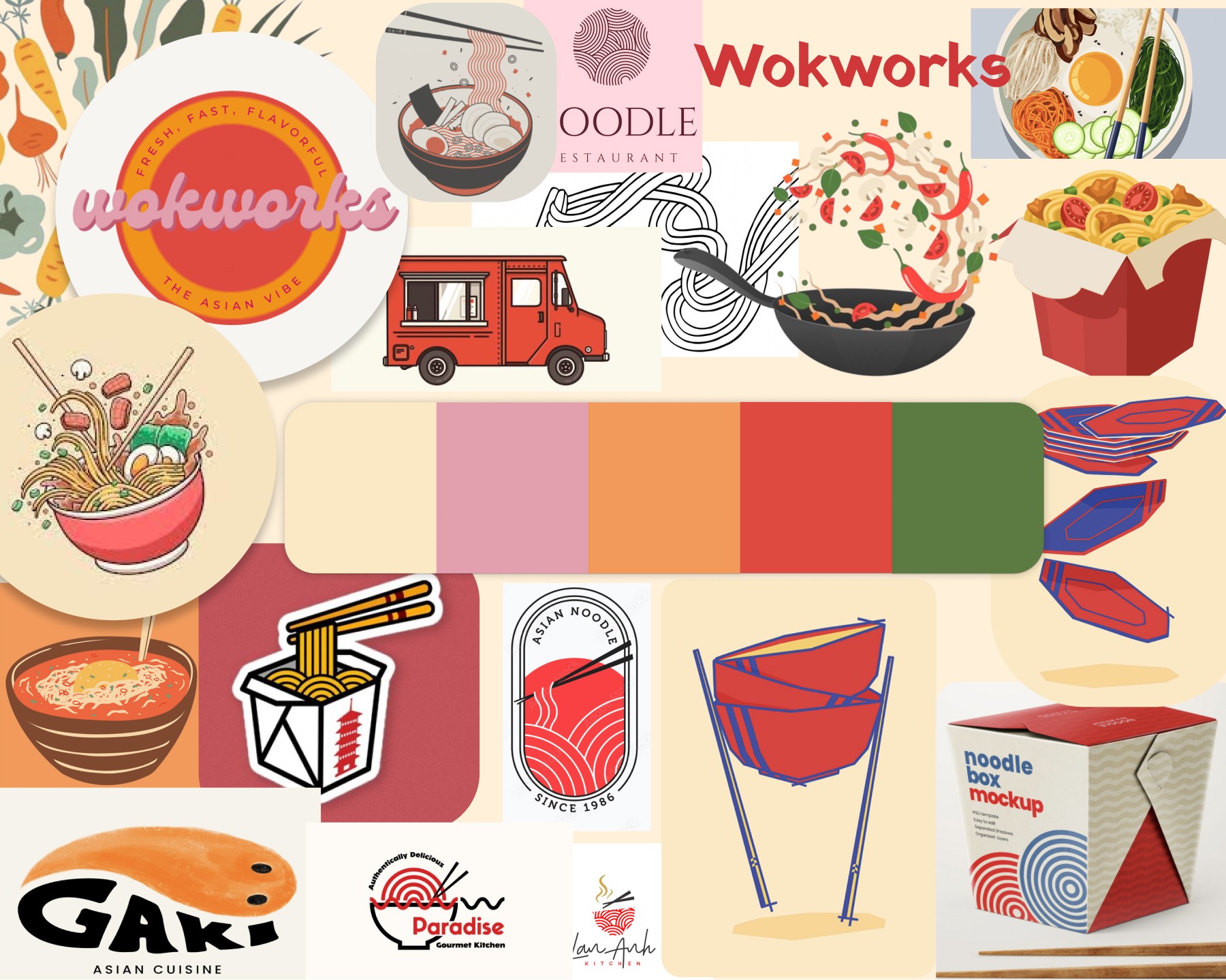 Rebranding Wokworks was a unique challenge as the food truck already had a strong and recognizable brand identity. Our professor tasked us with creating a completely new brand, including a fresh color palette, while still preserving the essence of Wokworks. To brainstorm a new brand, each of us created a moodboard and compiled them into one larger moodboard. We wanted to honor Wokworks's “vegetable-forward” approach by incorporating greens.